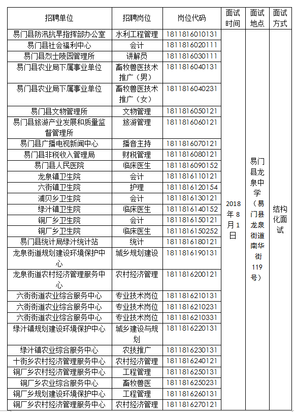 2018年易門縣事業(yè)單位招聘各崗位面試時間、地點和面試方式(非教師招聘崗位)