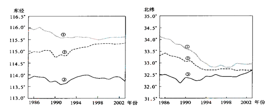 產(chǎn)業(yè)重心是區(qū)域產(chǎn)業(yè)產(chǎn)值空間分布的重心。下圖所示為中國三次產(chǎn)業(yè)重心的經(jīng)、緯度變化(不含臺灣、香港、澳門的統(tǒng)計資料)。完成21~23題。