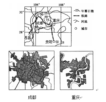27.讀我國某地區(qū)年霧日天數(shù)等值線圖及成都、重慶城市地域結(jié)構(gòu)示意圖,回答問題。(16分)