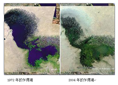 乍得湖,位于非洲中西部乍得、喀麥隆、尼日爾和尼日利亞交界處,它是其周圍約2000萬人口的水源。曾幾何時,乍得湖還是世界第六大湖泊,然而現(xiàn)在由于長期的干旱,乍得湖的面積日益萎縮?,F(xiàn)在的乍得湖面積只相當(dāng)于它過去的十分之一規(guī)模。乍得湖的流域面積有150萬平方公里。湖水幾乎有90%的水來自沙里河的注入,而北部潮濕地區(qū)卻幾乎沒有水能流入乍得湖。乍得湖的河床平而淺,即便是在沒有干旱以前,水位最深的地方也只不過5—8米。乍得湖領(lǐng)域曾經(jīng)有遼闊的濕地面積,因而其附近地區(qū)物產(chǎn)相當(dāng)豐富,同時也為野生生態(tài)環(huán)境的多樣性提供了保障。乍得湖面積的大規(guī)模縮小,最主要的原因是降雨量的銳減。這兩張圖片的對比清晰地表現(xiàn)了乍得湖水面面積的銳減,從1972年的22902平方公里縮減到了2004年的304平方公里。