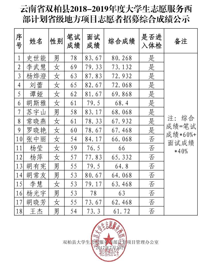 請(qǐng)進(jìn)入體檢的考生于2018年8月1日8:00攜帶個(gè)人有效身份證件及一寸近期免冠證件照前往雙柏縣人民醫(yī)院住院部前集中,由項(xiàng)目辦工作人員組織統(tǒng)一體檢。體檢前請(qǐng)勿進(jìn)食飲水,自備體檢費(fèi)用259.00元。若存在體檢不合格或近期有在崗志愿者離崗的情況,項(xiàng)目辦將根據(jù)實(shí)際情況進(jìn)行補(bǔ)錄?,F(xiàn)將綜合成績(jī)排名及進(jìn)入體檢人員名單公示如下,公示有效期為三天(2018年7月30日-2018年8月1日),如有異議,請(qǐng)向雙柏縣大學(xué)生志愿服務(wù)西部計(jì)劃項(xiàng)目管理辦公室(雙柏團(tuán)縣委辦公室)反映。