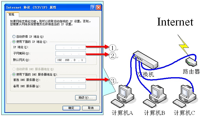 2.小軍家中有3臺電腦,他通過一個交換機把3臺電腦連成了一個局域網(wǎng),并通過路由器接入因特網(wǎng)。如圖,請根據(jù)圖示回答以下問題: