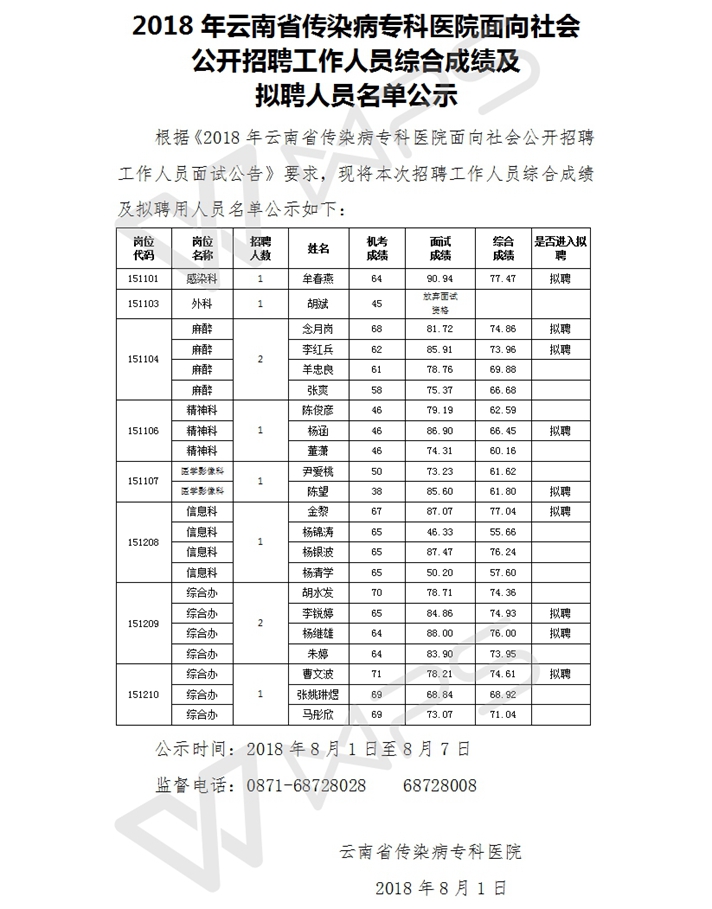 2018年云南省傳染病??漆t(yī)院招聘綜合成績及擬聘人員名單公示