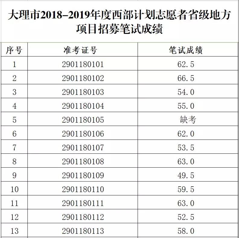 大理市2018—2019年度大學(xué)生志愿服務(wù)西部計(jì)劃省級(jí)地方項(xiàng)目志愿者招募筆試環(huán)節(jié)已結(jié)束。本次招募自7月24日發(fā)布公告以來,共72人報(bào)名,全部資格審查合格。8月4日上午9:00-11:00在下關(guān)四小舉行筆試,應(yīng)考72人,實(shí)考65人,缺考7人。根據(jù)《大理州2018-2019年度西部計(jì)劃志愿者省級(jí)地方項(xiàng)目招募工作實(shí)施方案》的規(guī)定,現(xiàn)將考生筆試成績公布如下: