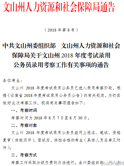 2018年度考試錄用 公務員錄用考察工作有關事項的通告