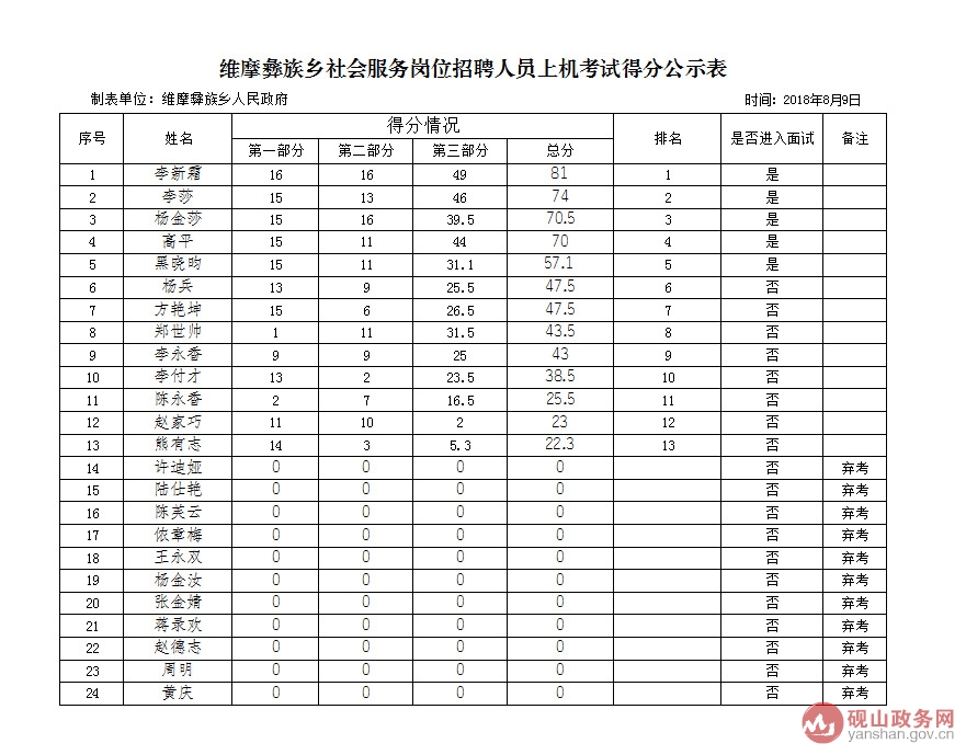 維摩彝族鄉(xiāng)扶貧辦購買社會服務崗位人員機試已于2018年8月9日結束,根據(jù)招聘程序,現(xiàn)將成績公告如下: