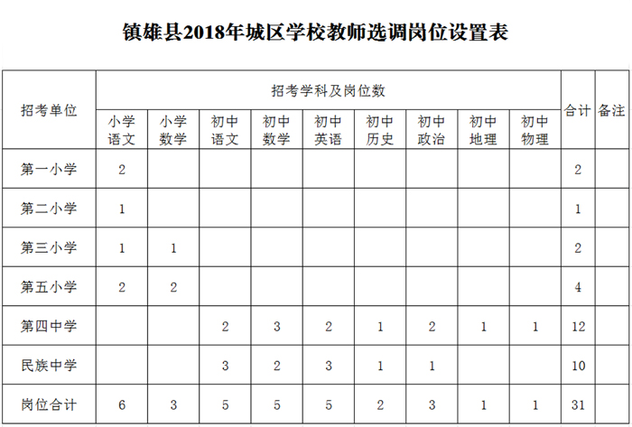 附:鎮(zhèn)雄縣2018年城區(qū)學(xué)校教師選調(diào)崗位設(shè)置表