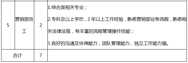 本次公開招聘崗位為:財務(wù)部員工1人(財務(wù)類),工程管理部員工2人(工程類),綜合部員工1人(綜合類),物業(yè)管理部員工1人(綜合類),營銷部員工2人(綜合類);共計7人。