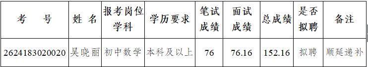 2018年8月20日初中數(shù)學(xué)崗位有1位考生放棄擬聘資格,根據(jù)《麻栗坡縣2018年特崗教師招聘公告》“若體檢后出現(xiàn)缺額的,可按總成績依次遞補(bǔ)”規(guī)定,現(xiàn)將順延遞補(bǔ)相關(guān)事項公告如下: