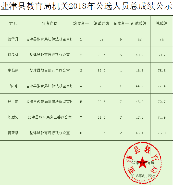 鹽津縣教育局機(jī)關(guān)2018年公選人員成績公示
