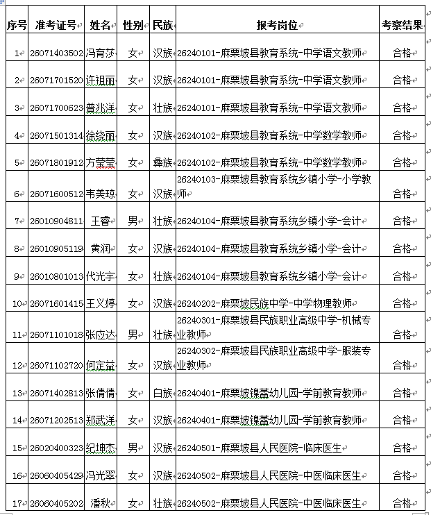 2018年麻栗坡縣事業(yè)單位公開招聘工作人員考察結(jié)果公布 各位考生: 2018年麻栗坡縣事業(yè)單位公開招聘工作人員考察工作已結(jié)束,現(xiàn)將考察結(jié)果公布如下: 2018年麻栗坡縣事業(yè)單位公開招聘工作人員考察結(jié)果