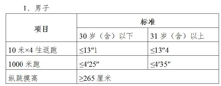 體能測評參照公安部《關(guān)于印發(fā)公安機關(guān)錄用人民警察體能測評項目和標準(暫行)的通知》及其所附標準進行。體能測試的項目如下: