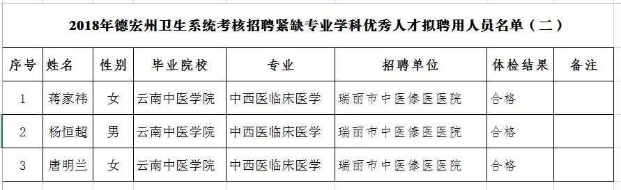 [附件:德宏州2018年衛(wèi)生系統(tǒng)考核招聘緊缺專業(yè)學(xué)科優(yōu)秀人才擬聘用人員名單(二)]