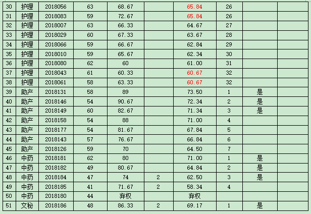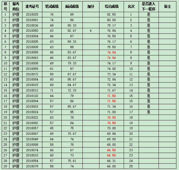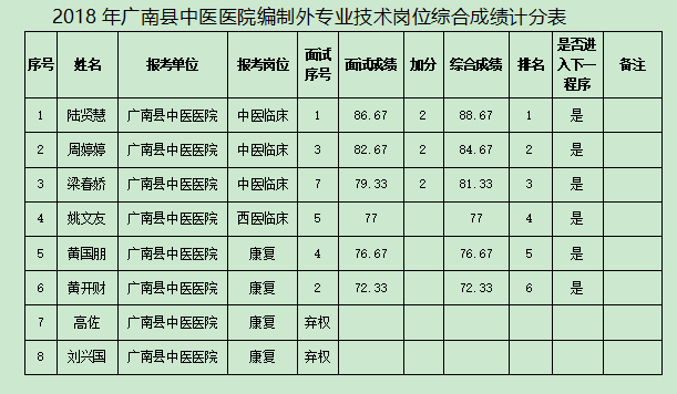 根據(jù)《廣南縣中醫(yī)醫(yī)院2018年招聘編外專業(yè)技術(shù)崗位公告》經(jīng)過報名、筆試、面試,對綜合成績進行計算(四舍五入保留兩位小數(shù)),綜合成績=筆試成績×50%+面試成績×50%+加分(初級師加4分、中級加6分、本科學(xué)歷加2分)?,F(xiàn)將綜合成績公示如下: