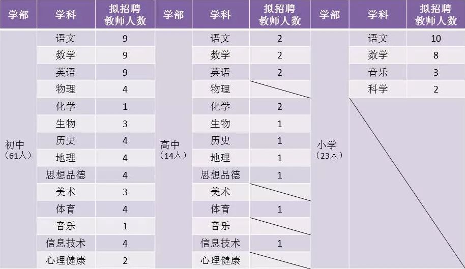為滿足社會(huì)對(duì)優(yōu)質(zhì)教育資源的需求,根據(jù)學(xué)校辦學(xué)發(fā)展需要及人才儲(chǔ)備計(jì)劃,今年,我校建設(shè)路校區(qū)、昆明湖校區(qū)及潤城學(xué)校面向省內(nèi)外招聘德才兼?zhèn)涞膬?yōu)秀教師,具體如下: