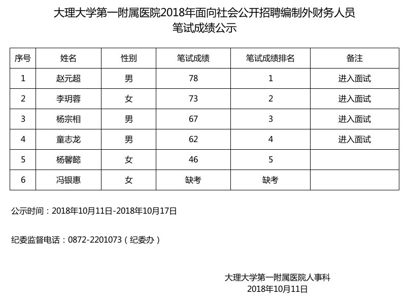 大理大學(xué)第一附屬醫(yī)院2018年面向社會(huì)公開(kāi)招聘編制外財(cái)務(wù)人員 筆試成績(jī)公示