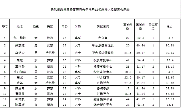 景洪市政務(wù)服務(wù)管理局關(guān)于考錄12名編外人員情況公示