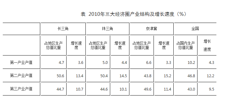 三大經(jīng)濟圈中,2010年三次產(chǎn)業(yè)增長速度均超過全國平均水平的有幾個?