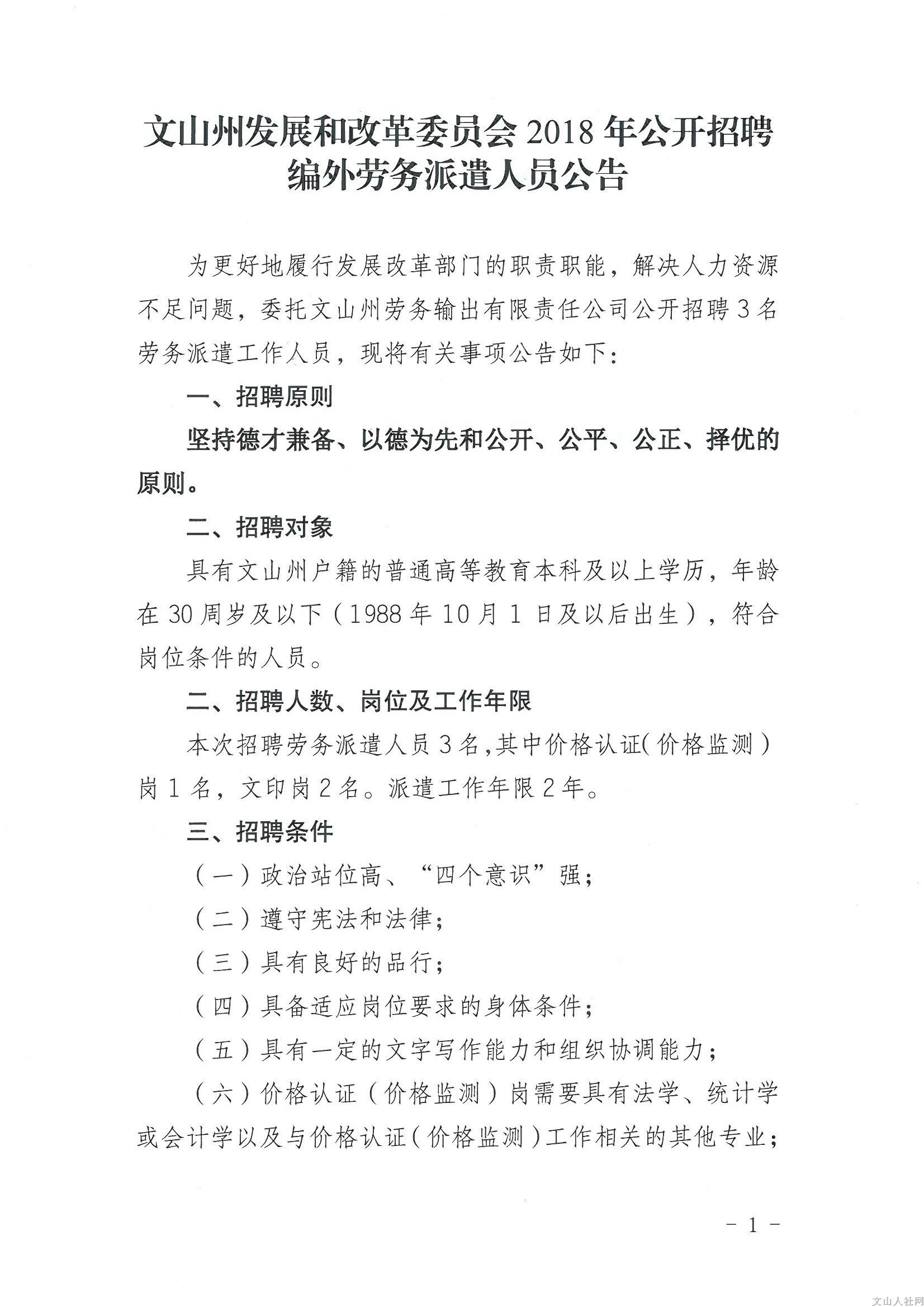 文山州發(fā)展和改革委員會(huì)2018年公開招聘編外勞務(wù)派遣人員公告