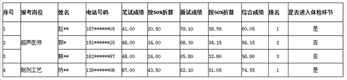 玉溪市中醫(yī)醫(yī)院2018年招聘編制外合同制人員綜合成績公示 根據(jù)《玉溪市中醫(yī)醫(yī)院2018年招聘編制外合同制人員公告》和相關(guān)規(guī)定,玉溪市中醫(yī)醫(yī)院經(jīng)過報名、資格審查、筆試以及面試,確定進入體檢人員名單如下: 玉溪市中醫(yī)醫(yī)院2018年招聘編制外合同制人員綜合成績