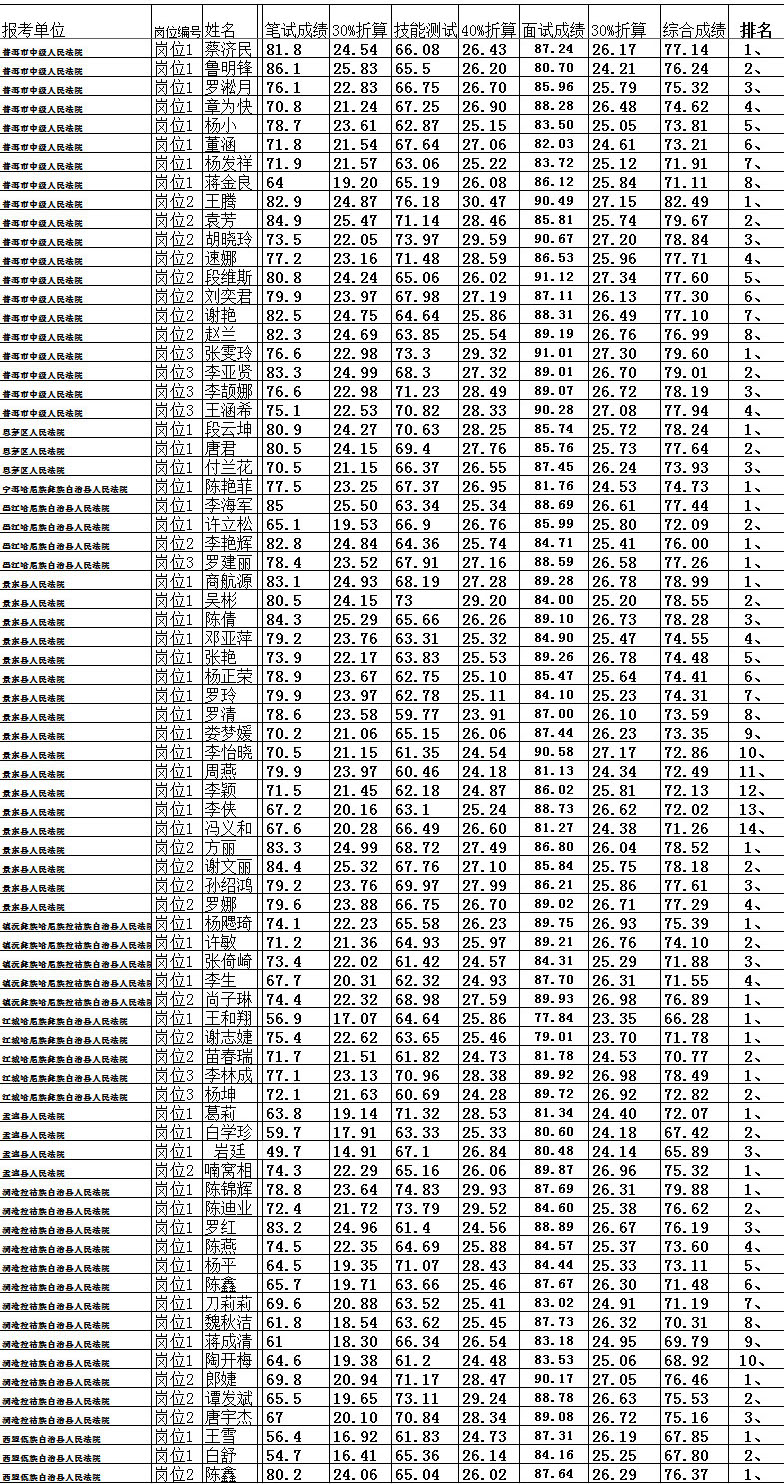 根據(jù)《云南省法院系統(tǒng)2018年公開招聘聘用制書記員公告》、省高院政治部《關(guān)于做好云南省法院系統(tǒng)2018年招聘聘用制書記員相關(guān)工作的通知》精神,2018年普洱市法院系統(tǒng)公開招聘聘用制書記員工作,經(jīng)上報計劃、網(wǎng)絡(luò)報名、資格審核、筆試、技能測試、面試程序。按招聘崗位現(xiàn)將進入體檢人員公告如下: