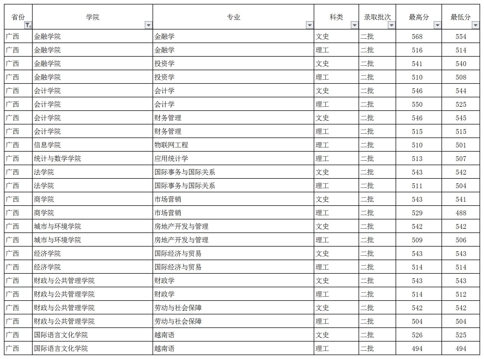 云南財經(jīng)大學2018年廣西壯族自治區(qū)錄取情況一覽表