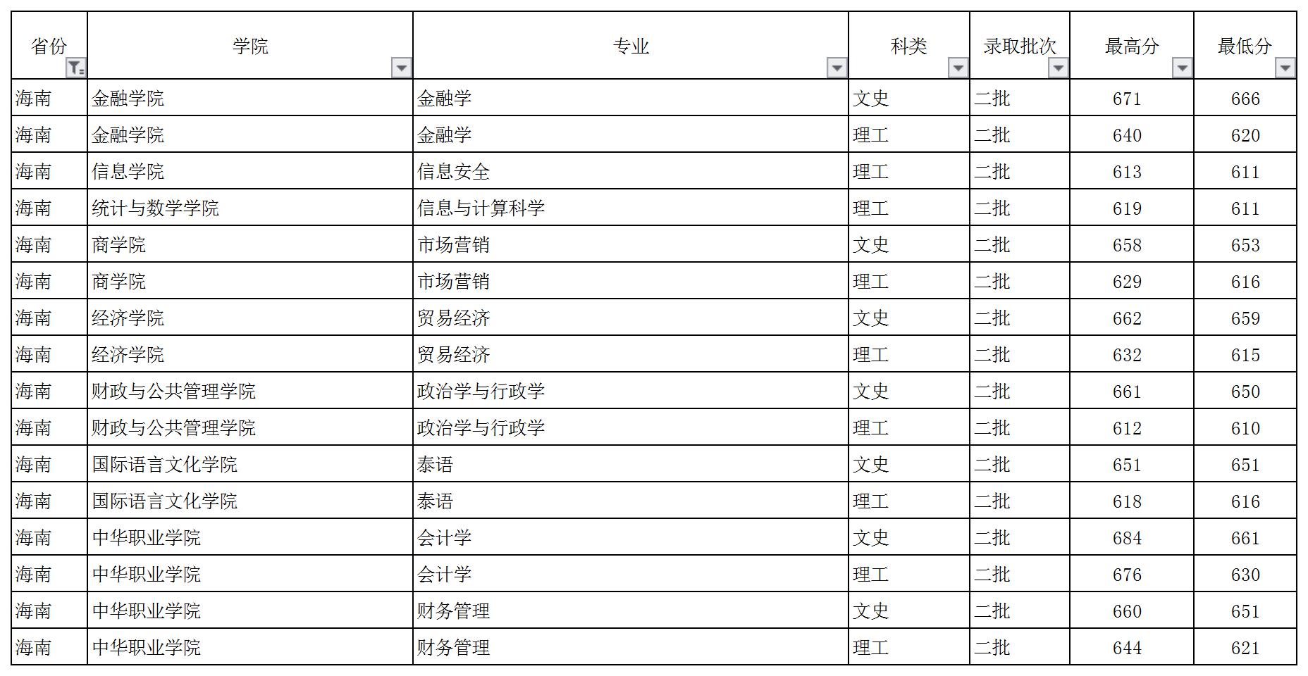 云南財經(jīng)大學2018年海南省錄取情況一覽表
