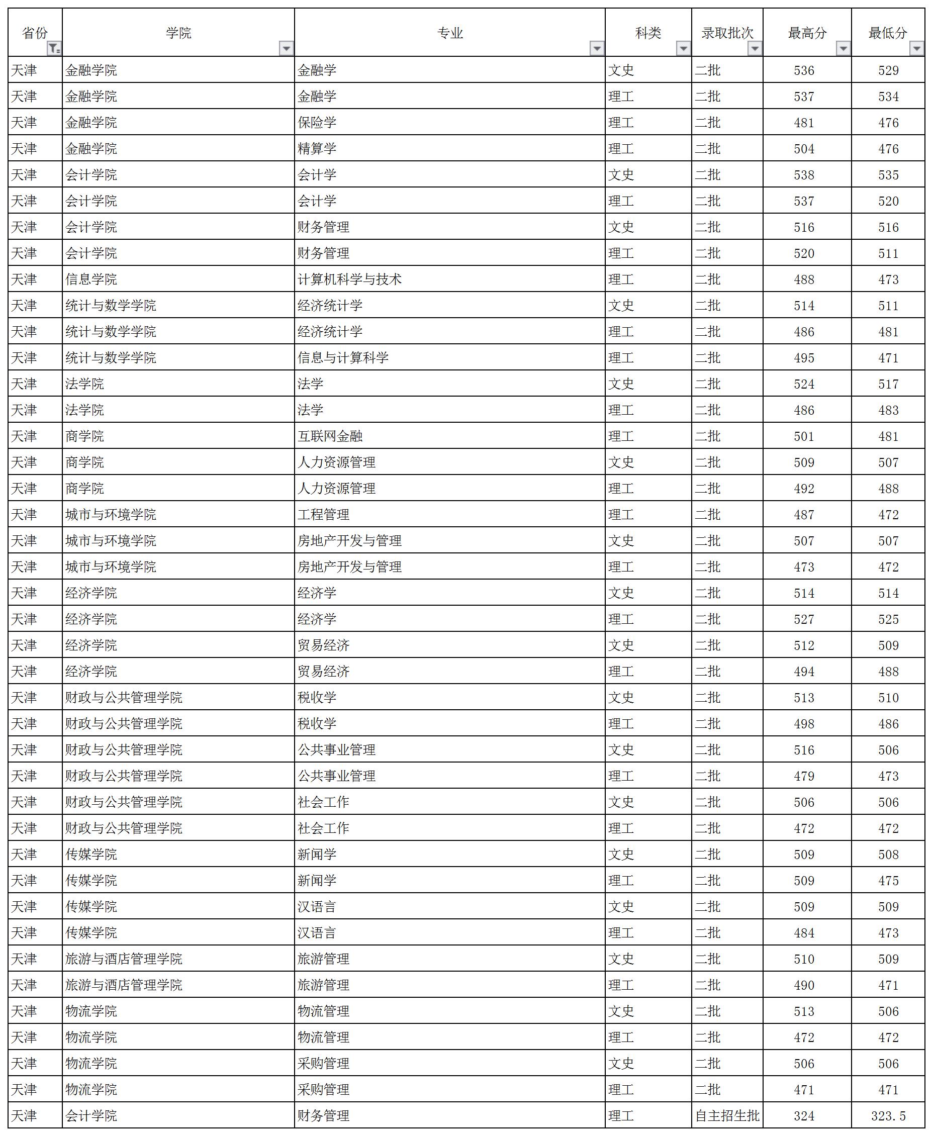 云南財(cái)經(jīng)大學(xué)2018年天津市錄取情況一覽表
