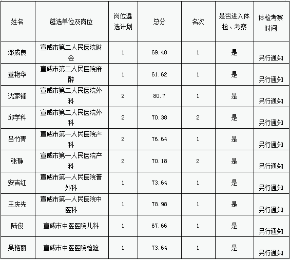 根據(jù)《中共宣威市委辦公室、宣威市人民政府辦公室關(guān)于印發(fā)〈宣威市市屬事業(yè)單位公開遴選工作人員實(shí)施辦法(試行)〉的通知》(宣辦發(fā)〔2017〕115號(hào))規(guī)定,按照《宣威市衛(wèi)生和計(jì)劃生育局所屬事業(yè)單位2018年公開遴選工作人員實(shí)施方案》的程序安排,遴選工作的筆試、經(jīng)歷業(yè)績?cè)u(píng)價(jià)、面試工作已全部結(jié)束,進(jìn)入面試考生的總成績已于2018年12月11日在宣威市人民政府門戶網(wǎng)站進(jìn)行公告,現(xiàn)將宣威市衛(wèi)生和計(jì)劃生育局所屬事業(yè)單位2018年公開遴選工作人員擬進(jìn)入體檢、考察人員進(jìn)行公示。