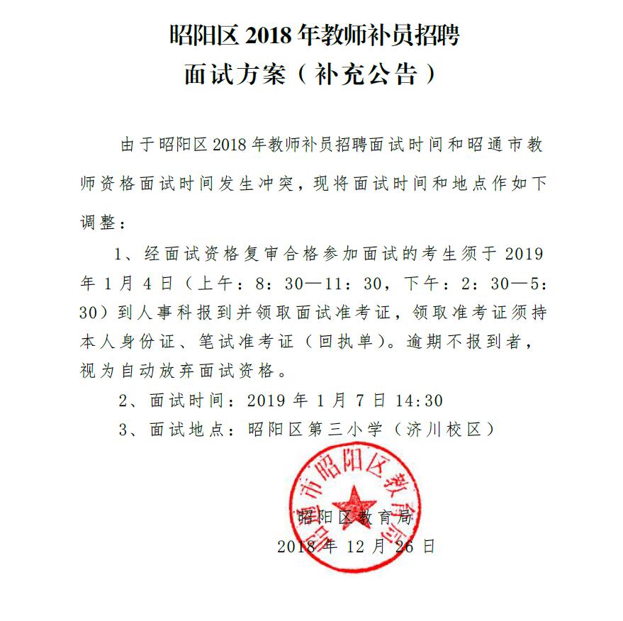 昭通市昭陽區(qū)2018年教師補(bǔ)員招聘面試方案(補(bǔ)充公告)