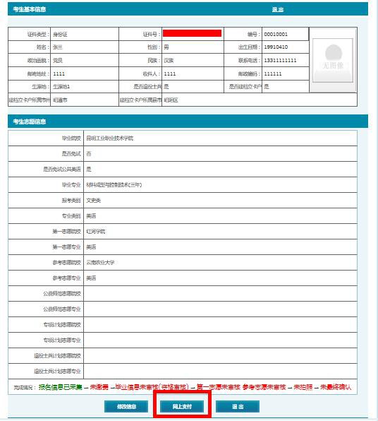 3、點(diǎn)擊信息展示頁(yè)面中【網(wǎng)上支付】按鈕,交報(bào)名費(fèi)。