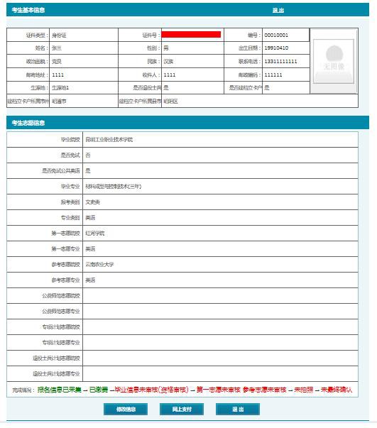 6、點(diǎn)擊【返回】按鈕,返回報(bào)名信息展示頁(yè)面,如需更改信息,點(diǎn)擊【修改信 息】按鈕,如無(wú)誤后及時(shí)退出系統(tǒng)。