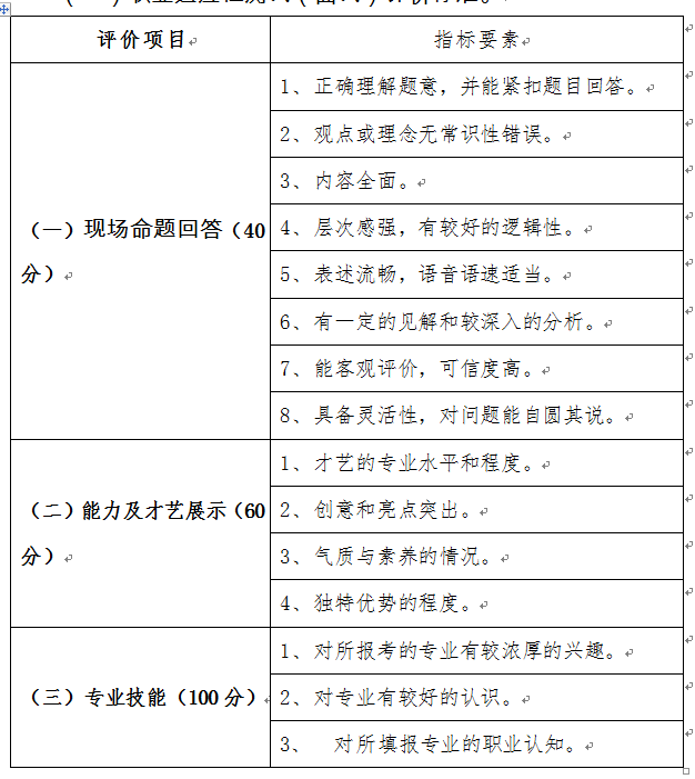 (三)考核內(nèi)容:主要考核內(nèi)容包括現(xiàn)場(chǎng)命題回答;能力及才藝展示;專業(yè)技能測(cè)試三個(gè)部分,共200分。