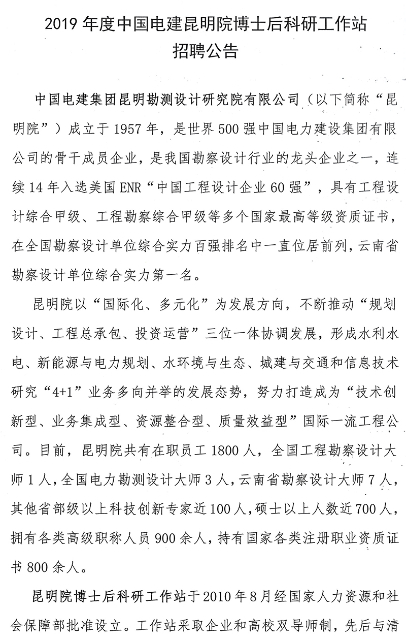 | 2019年度昆明院博士后人員招聘信息 | |||||||||