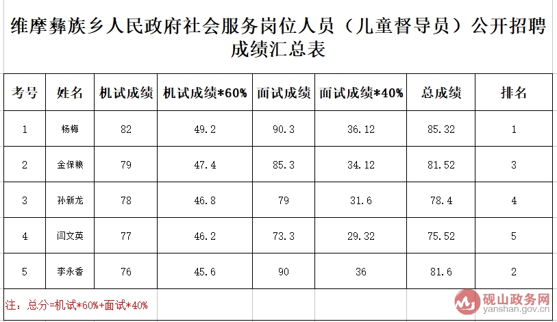 維摩彝族鄉(xiāng)人民政府社會服務(wù)崗位人員機(jī)試和面試已于2019年1月16日結(jié)束,根據(jù)招聘程序,現(xiàn)將機(jī)試成績、面試成績、總成績公告如下: