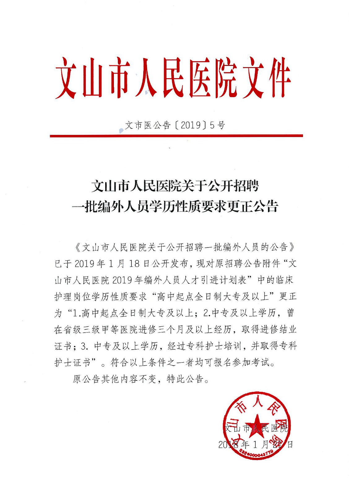 2019年文山市人民醫(yī)院招聘一批編外人員學(xué)歷性質(zhì)要求更正公告
