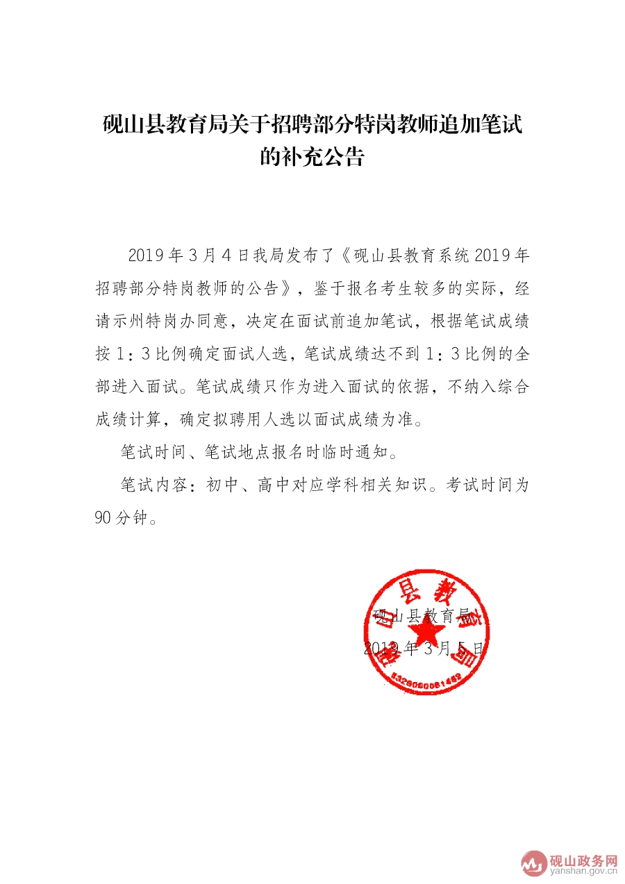 硯山縣教育局關(guān)于招聘部分特崗教師追加筆試的補充公告