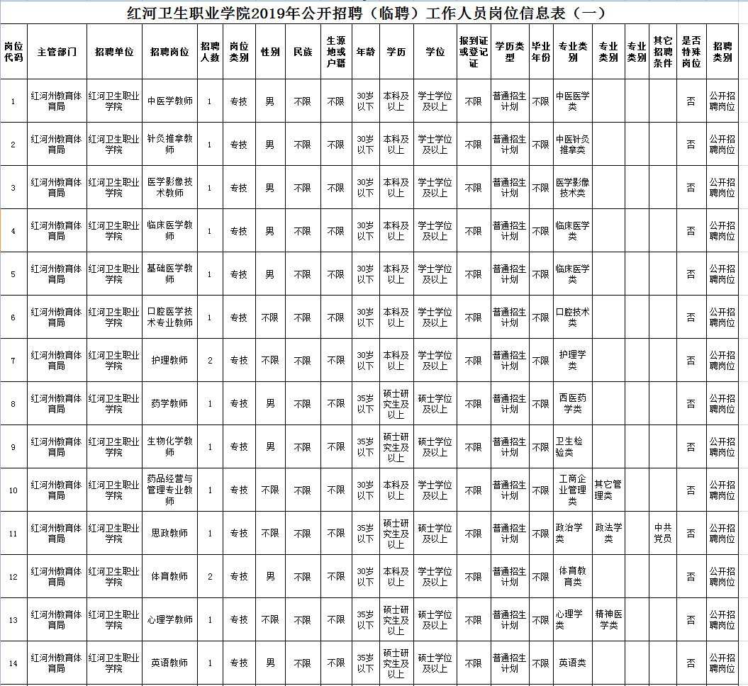 附件1紅河衛(wèi)生職業(yè)學(xué)院2019年公開招聘(臨聘)工作人員崗位信息表(一)