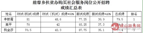維摩彝族鄉(xiāng)扶貧辦購買社會服務崗位根據(jù)招聘程序組織招聘,共購買社會服務崗位人員2名,現(xiàn)由于其中1名人員辭職,根據(jù)硯山縣扶貧局招聘程序及我鄉(xiāng)2018年8月組織的社會服務崗位公開招聘總成績排名,現(xiàn)進行補錄:
