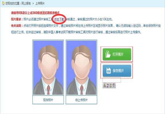 點(diǎn)擊“照片要求”中的“點(diǎn)擊下載”下載照片審核處理工具,處理報(bào)名照片,照片通過審核工具審核后,點(diǎn)擊“打開照片”按鈕選擇要上傳的照片,輸入驗(yàn)證碼,點(diǎn)擊“保存照片”,上傳成功后跳轉(zhuǎn)到照片確認(rèn)頁面,如下圖所示: