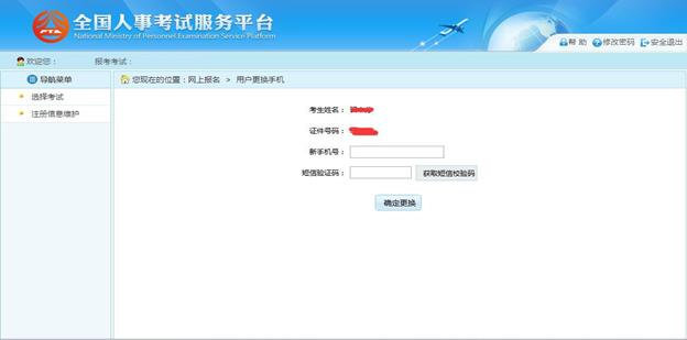 在該頁面可以完成對密碼找回及答案信息進(jìn)行修改,也可更換綁定的手機(jī)號。點(diǎn)擊“更換手機(jī)”按鈕,跳轉(zhuǎn)到更換手機(jī)頁面,通過該頁面可以完成綁定手機(jī)號的更換操作。