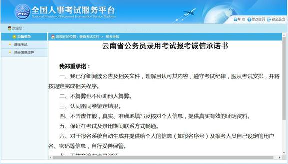 點(diǎn)擊“接受”按鈕,進(jìn)入查看考生承諾書的頁面,如下圖所示: