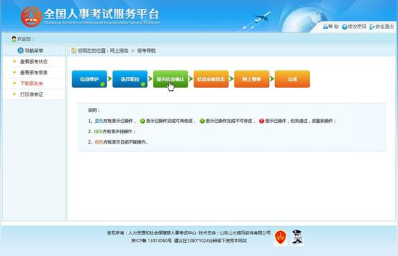 通過點(diǎn)擊“確認(rèn)”按鈕,提示確認(rèn)成功后跳轉(zhuǎn)到報(bào)考流程頁面,則完成填報(bào)信息操作。如下圖所示: