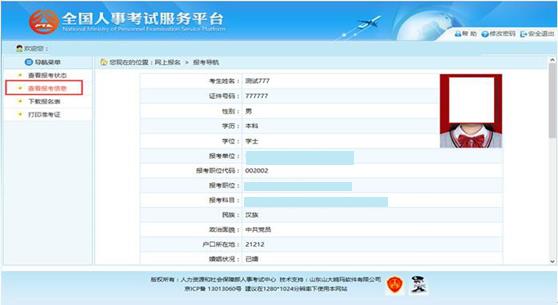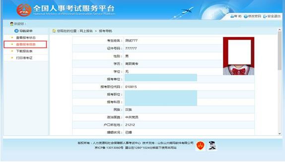 考生可以通過點(diǎn)擊“查看報(bào)考信息”按鈕,查看考生填寫的報(bào)考信息,如下圖所示: