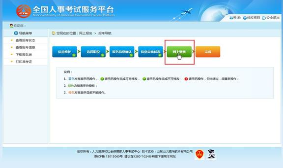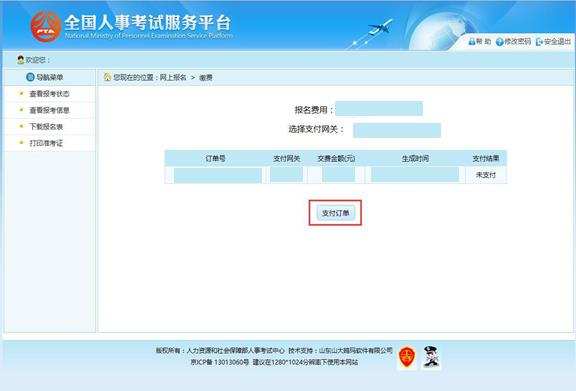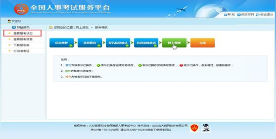 通過審核的考生可以進(jìn)行網(wǎng)上繳費(fèi),點(diǎn)擊報(bào)考流程中“網(wǎng)上繳費(fèi)”選項(xiàng),可以進(jìn)入網(wǎng) 上繳費(fèi)的頁面,如下圖所示: