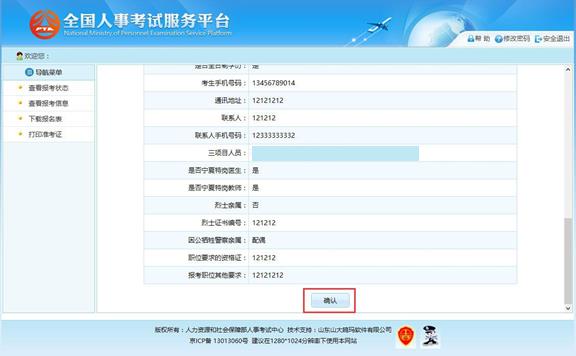 點(diǎn)擊“報(bào)名信息確認(rèn)”按鈕后,跳轉(zhuǎn)到報(bào)名信息確認(rèn)頁面,如下圖所示: