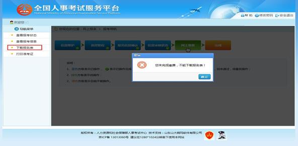 點(diǎn)擊系統(tǒng)導(dǎo)航菜單的“下載報(bào)名表”選項(xiàng),可以下載考生信息表;下載考生信息表操 作必須在考生完成繳費(fèi)之后才能進(jìn)行,如果考生未完成繳費(fèi)點(diǎn)擊“下載報(bào)名表”菜單,系 統(tǒng)會提示“您未完成繳費(fèi),不能下載報(bào)名表”。如下圖所示:
