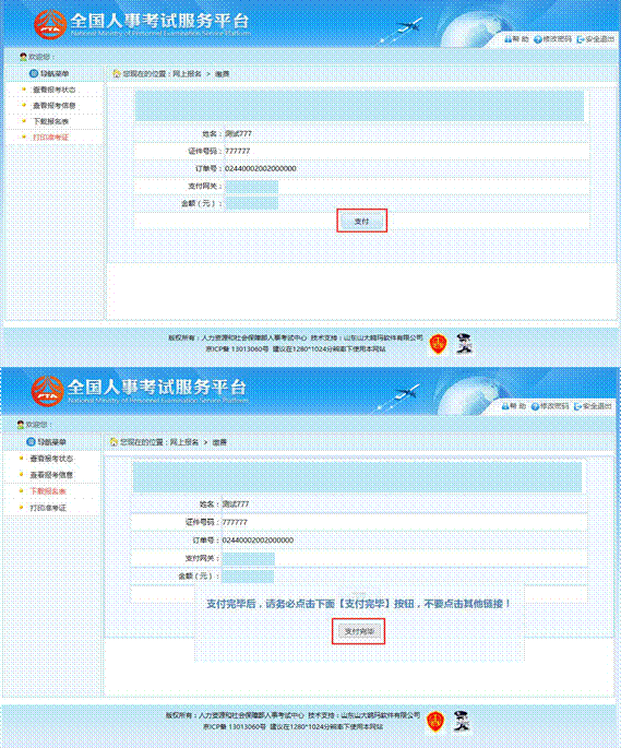 訂單確認(rèn)無誤后,點(diǎn)擊“支付”按鈕,成功后再點(diǎn)擊“支付完畢”按鈕完成網(wǎng)上支付 操作,如下圖所示: