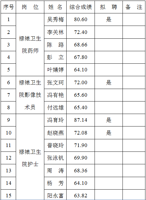 根據(jù)《云南昆鋼醫(yī)院2019年社區(qū)衛(wèi)生工作人員(非事業(yè)編制)招聘啟事》的相關(guān)安排,經(jīng)過(guò)現(xiàn)場(chǎng)報(bào)名、資格審查、筆試、面試、體檢等程序,經(jīng)醫(yī)院招聘人員工作領(lǐng)導(dǎo)小組辦公室審批,現(xiàn)將綜合成績(jī)和擬聘名單公示如下: