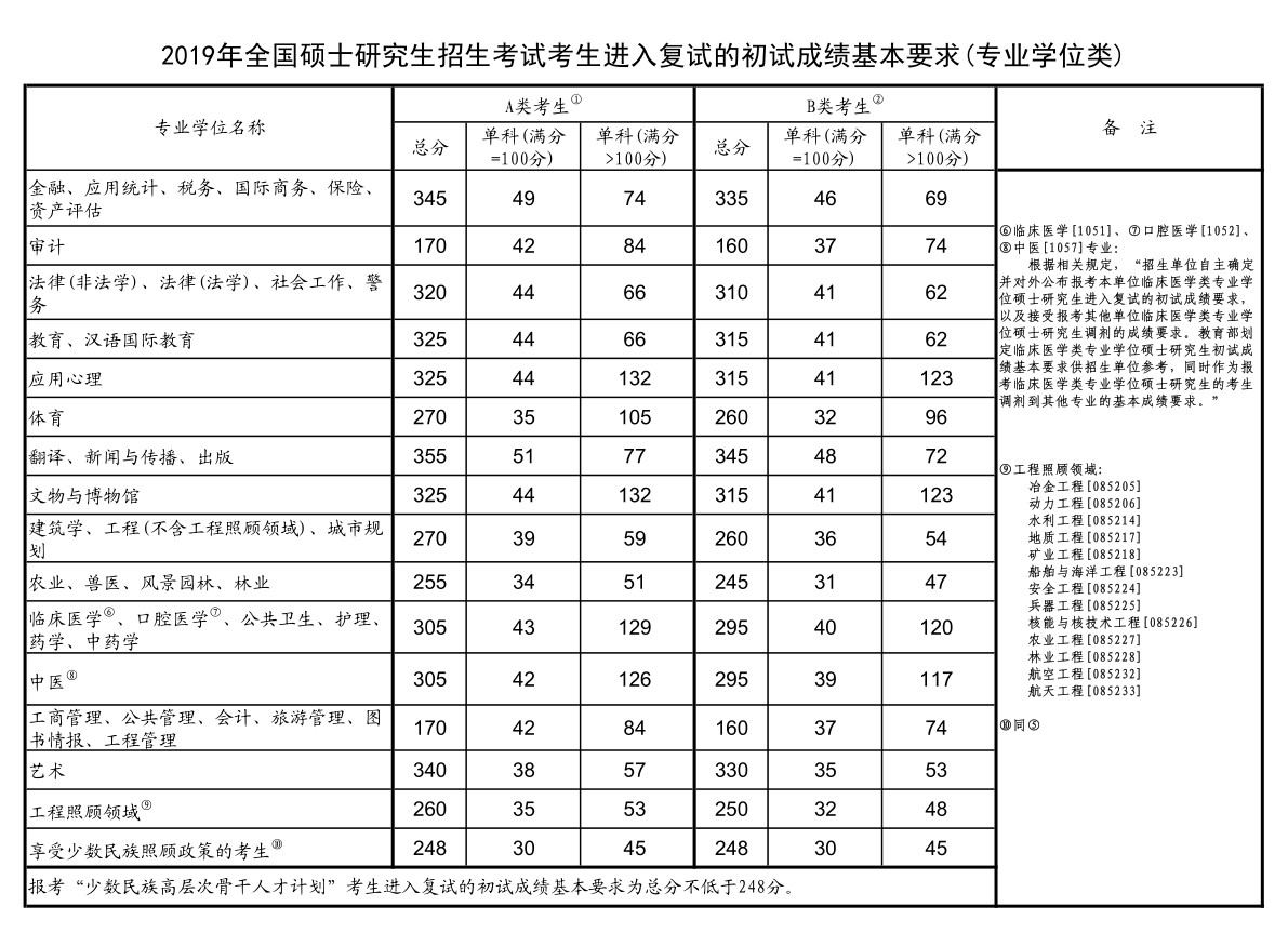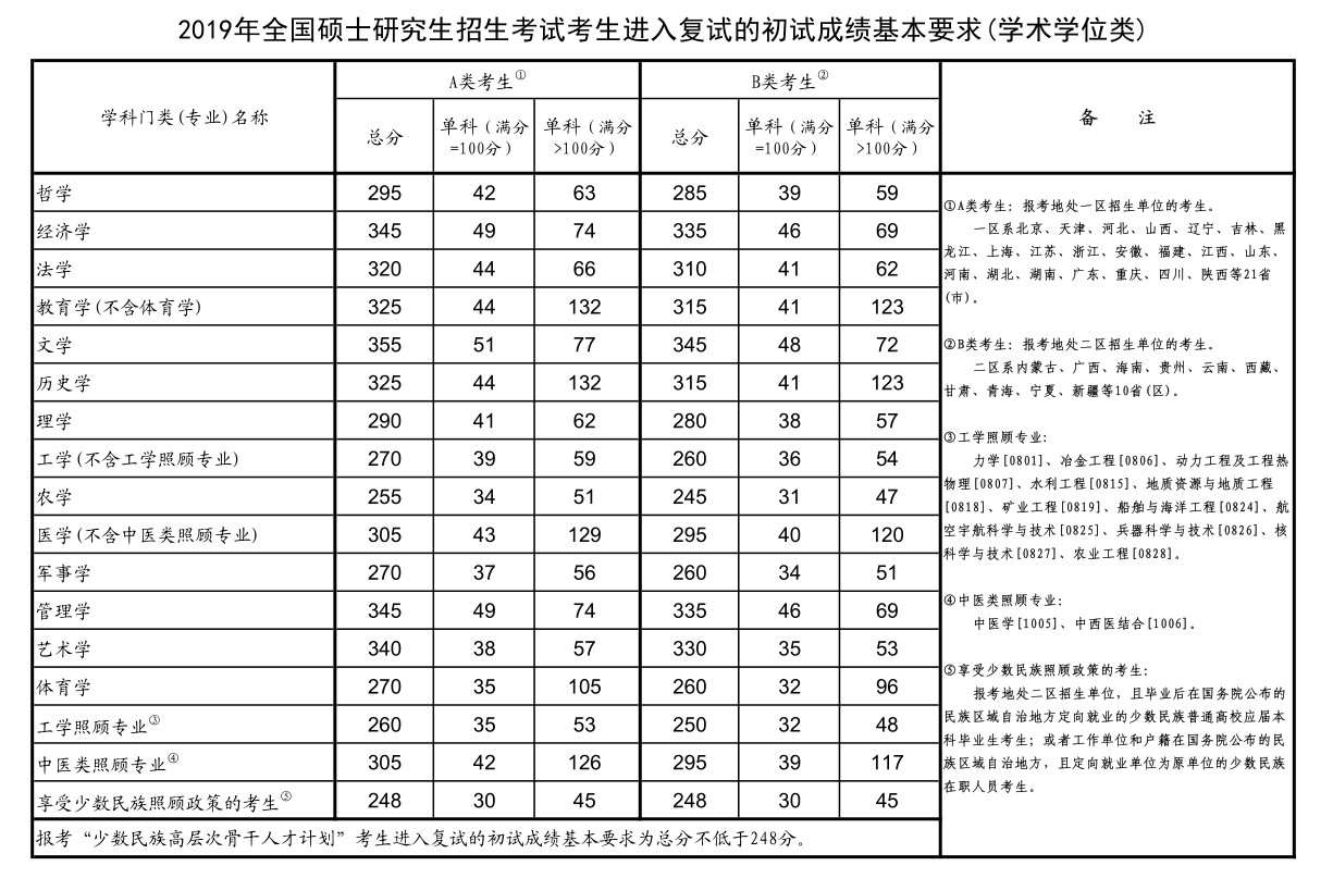 2019年全國(guó)碩士研究生招生考試考生進(jìn)入復(fù)試的初試成績(jī)基本要求